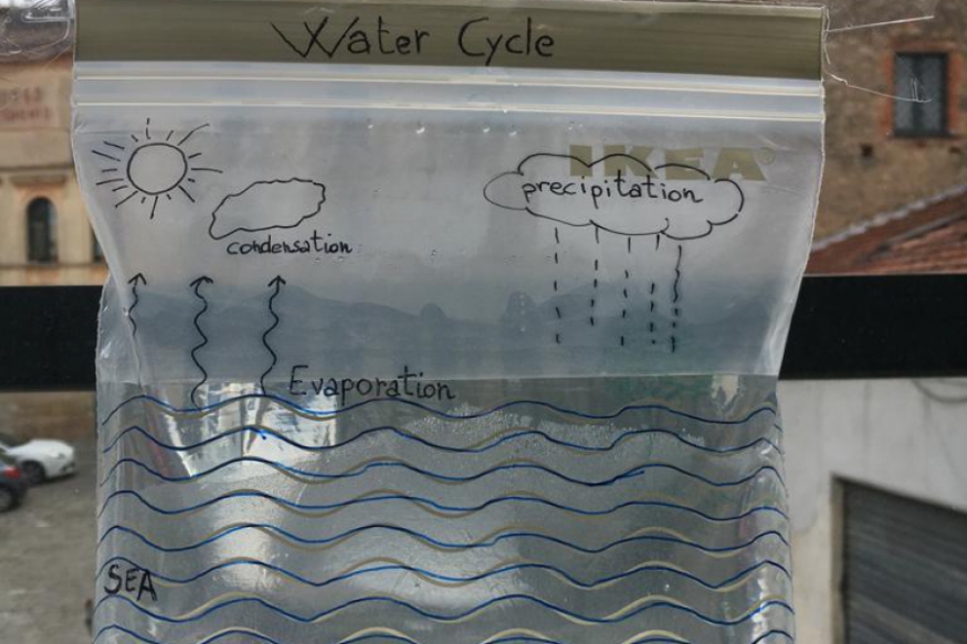 E come, attraverso esperimenti concreti (abbiamo lasciato un bicchiere d’acqua nel congelatore e poi ne abbiamo osservato lo scioglimento), le condizioni ambientali, il Sole e la temperatura possono generare dei cambiamenti di stato nell’acqua. Fino ad arrivare al vero e proprio ciclo dell’acqua: