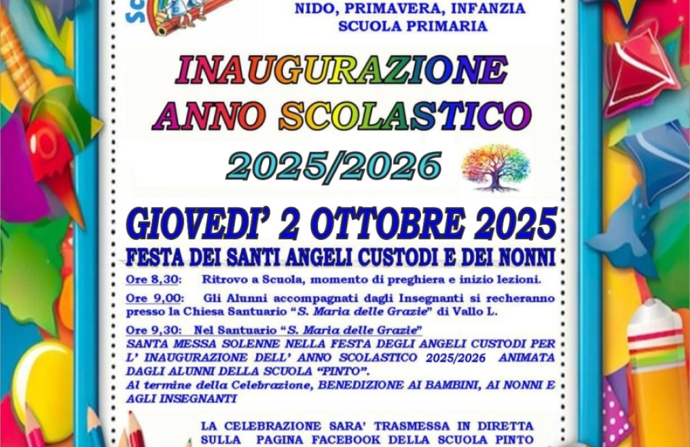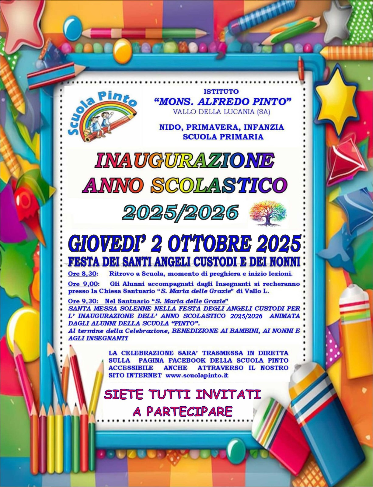 VALLO L. - In occasione della festa degli Angeli Custodi e della festa dei Nonni che si celebrerà il 2 Ottobre, la Scuola "Mons. Alfredo Pinto" di Vallo della Lucania, inaugurerà ufficialmente l' anno scolastico 2024/2025 con una piacevole giornata di festa.